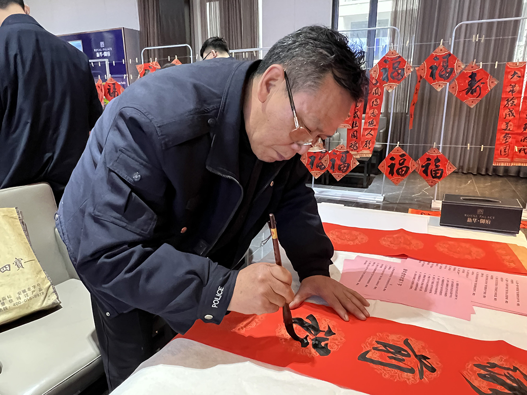 春联,又叫“春贴”、“门对”、“对联”,它以对仗工整、简洁精巧的文字形式描绘生活意向,抒发美好愿望。每逢春节,家家户户都要挑选寓意幸福吉祥的红春联贴于门上,辞旧迎新,增加喜庆的节日氛围。书法老师专心致志的挥毫书写,一笔笔铿锵有力,神妙绝伦。压纸、沾墨、起笔、收笔,一起一落之间,一幅幅充满喜庆、吉祥、祝福的春联,在他们的手中完美呈现,墨香飘溢,场面热烈。