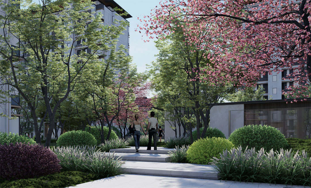 给工作了一天的御著主人们最富仪式感的归家。入口、轴线、洋房、叠墅四大空间用不同草木、花卉多层次组团种植,开阔草坪,与丰富绿化相互结合,用绿意点缀健康星空(中国)。享受踏进门为礼,轴为序,庭为意,园为逸的归家礼序中,景观与社区融为一体,一步一景。新华御著将中国传统的归家礼序与西方现代美学相结合,打造独有的归家美学。星级酒店式入户展示了更尊崇的归家门仪,水景与绿岛设计结合,林荫夹道围合的仪式感,一景双道,给予归家的尊贵。