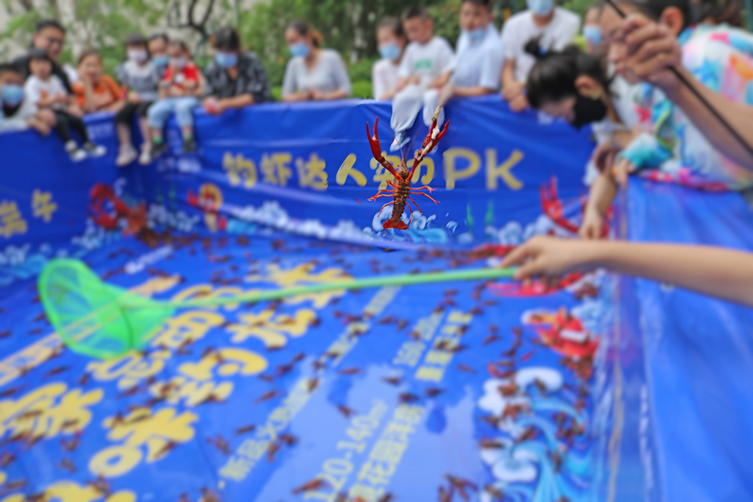 面对池内挥舞着钳子的龙虾,大人小孩都跃跃欲试,亲朋好友齐助阵,或冲锋陷阵、或出谋划策,每当鲜活的龙虾一个一个被成功钓起,场上就会发出欢乐尖叫声。